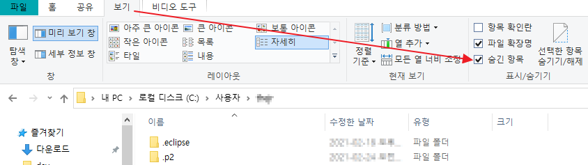 여기서 숨긴 폴더(.eclipse, .p2)는 C:\Users\사용자이름에 있고,