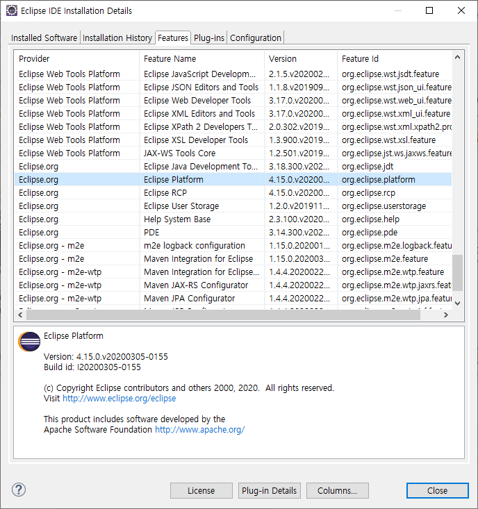 설치 세부 정보에서 Features → Eclipse.org의 Eclipse Platform에서도 동일하게 버전 확인이 가능합니다.